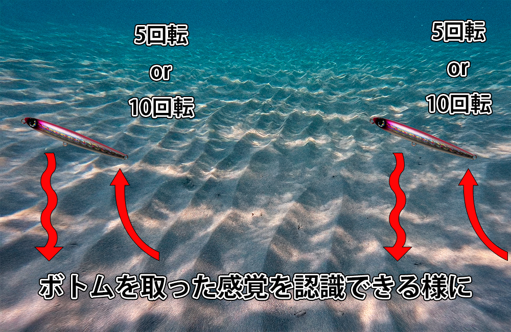 ①5~10回巻く(ゆっくりルアーの抵抗を感じる程度に)