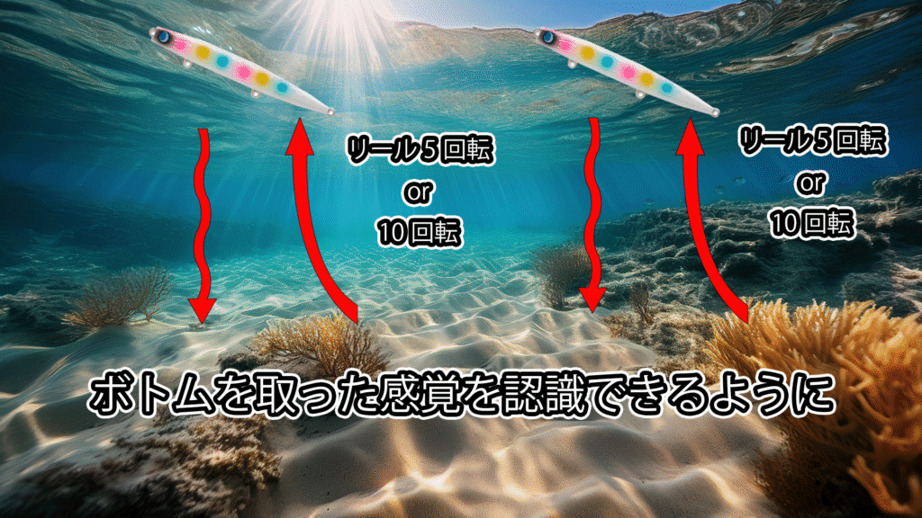 ③3秒程ステイ(フォールさせて魚に捕食スイッチを入れる&底を取る)